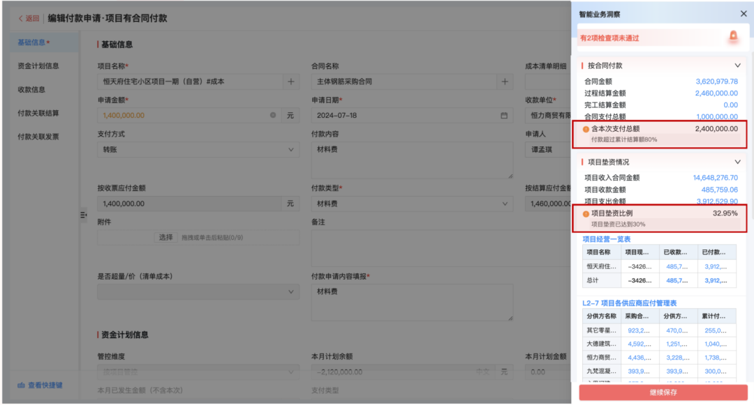 通過系統(tǒng)實時看得到公司資金情況,明確知道哪些項目能有資金去做去投資、哪些資金要計劃對外結(jié)算支付,項目現(xiàn)在開了多少票、還有多少錢沒有回,同時也能對進度款、質(zhì)保金、投標保證金等回款設置提醒,防止逾期未回。項目墊資情況也能同步關注,判斷公司的經(jīng)營狀況是否穩(wěn)健。
