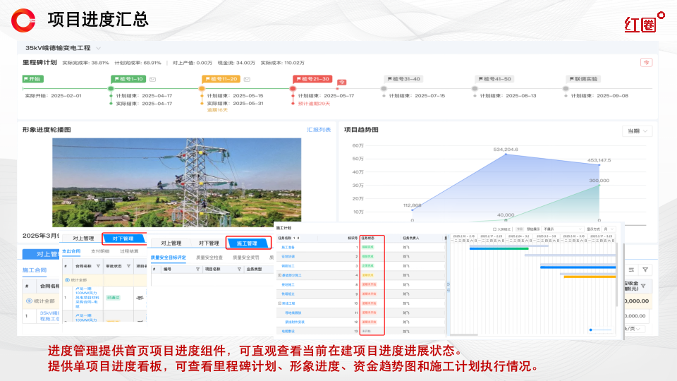 第一階段,先實(shí)現(xiàn)數(shù)據(jù)的線上化與可視化,通過(guò)紅圈系統(tǒng)將“對(duì)上對(duì)下合同、應(yīng)收應(yīng)付、人材機(jī)成本”等關(guān)鍵經(jīng)營(yíng)數(shù)據(jù)統(tǒng)一匯聚,讓管理層能夠清晰掌握項(xiàng)目的經(jīng)營(yíng)現(xiàn)狀,實(shí)現(xiàn)“系統(tǒng)先跑起來(lái)、數(shù)據(jù)先聯(lián)通”的初步目標(biāo)。在此基礎(chǔ)上,公司后續(xù)將進(jìn)一步依托紅圈系統(tǒng)搭建成本管控體系,逐步實(shí)現(xiàn)成本管理的標(biāo)準(zhǔn)化、精細(xì)化和動(dòng)態(tài)化。