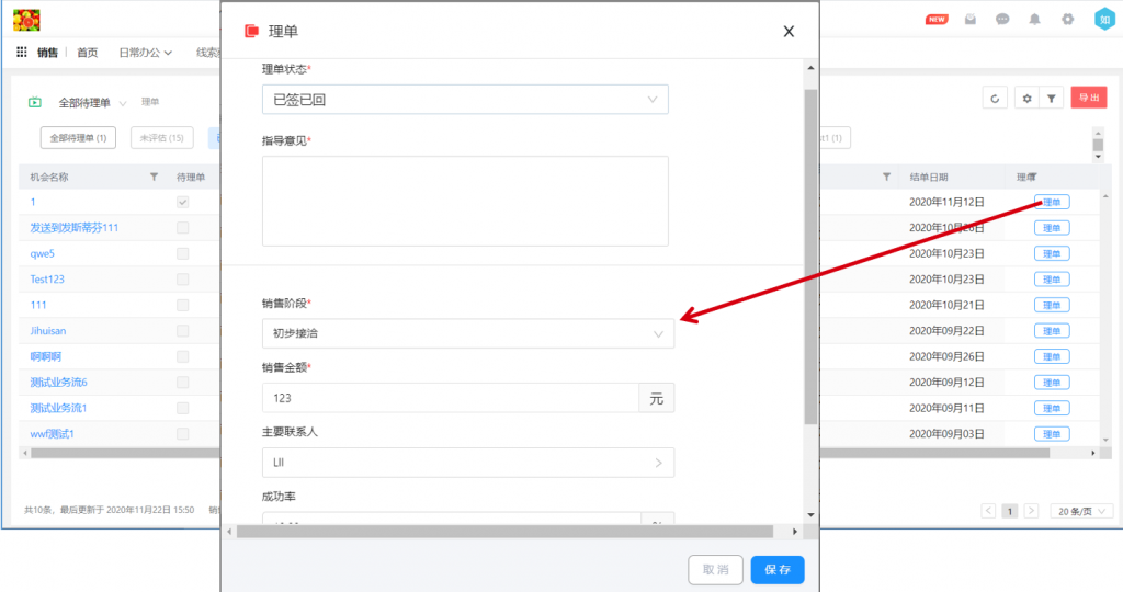 1) 理單頁面顯示及邏輯調整,單獨顯示待理單數據和按理單階段顯示全部銷售機會,理單后數據直接顯示到指定的理單階段;