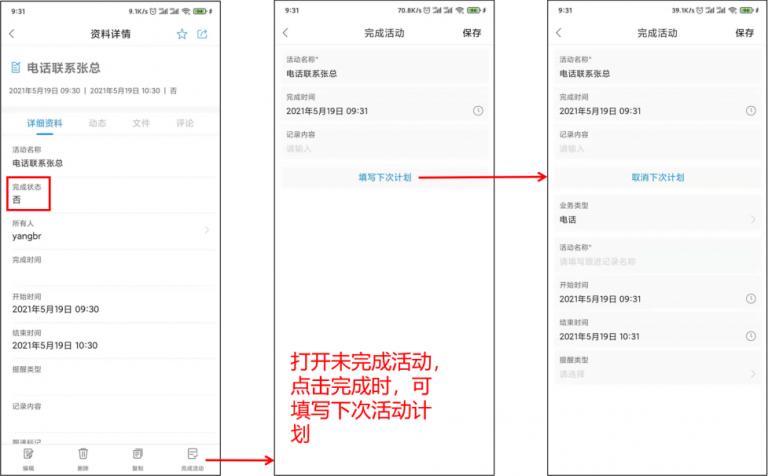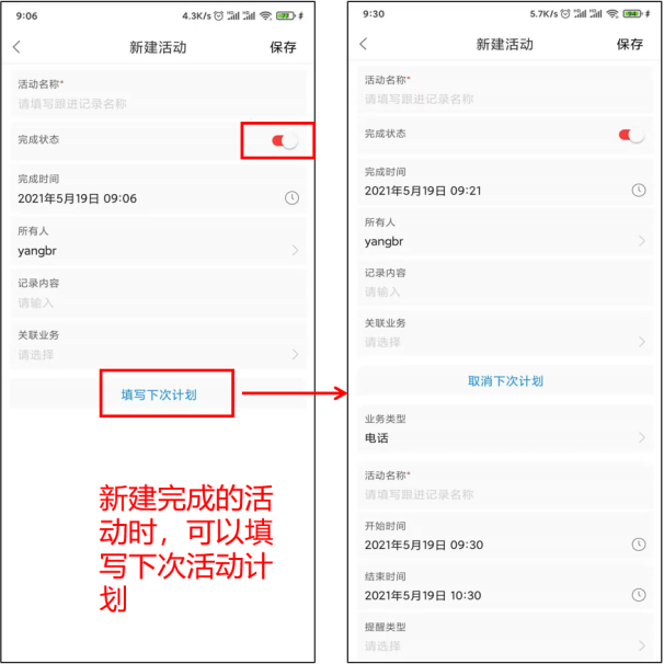 APP端活動列表可以在列表頁直接新建,完成活動時可快速填寫“下次計劃”