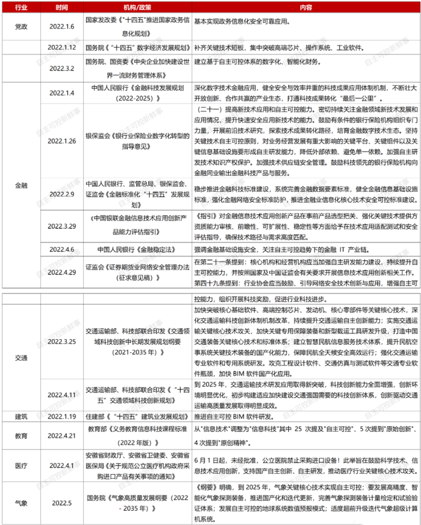 以下為2022年上半年頂層設(shè)計(jì)對“信創(chuàng)、國產(chǎn)化”的相關(guān)政策匯總: