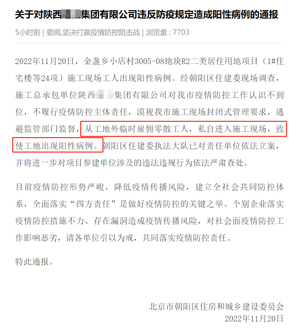 日前,北京市朝陽區(qū)住建委發(fā)布了關(guān)于《關(guān)于對陜西XX集團(tuán)有限公司違反防疫規(guī)定造成陽性病例的通報(bào)》。