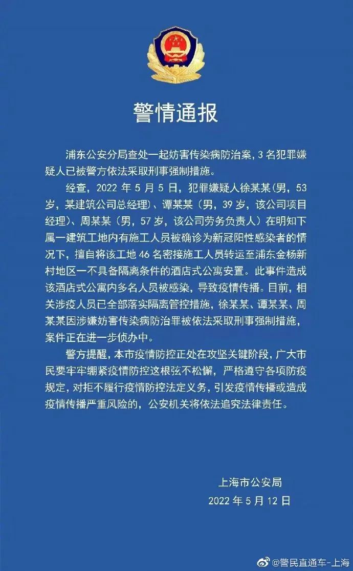 據(jù)上海市公安局通報(bào)經(jīng)查,5月5日,犯罪嫌疑人徐某某(男,53歲,某建筑公司總經(jīng)理)、譚某某(男,39歲,該公司項(xiàng)目經(jīng)理)、周某某(男,57歲,該公司勞務(wù)負(fù)責(zé)人)在明知下屬一建筑工地內(nèi)有施工人員被確診為新冠陽性感染者的情況下,擅自將該工地46名密接施工人員轉(zhuǎn)運(yùn)至不具備隔離條件的酒店式公寓安置。造成該酒店式公寓內(nèi)多名人員被感染,導(dǎo)致疫情傳播。