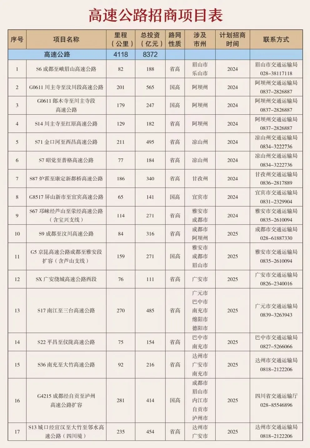 此次座談會(huì)重點(diǎn)集中推介36個(gè)高速公路項(xiàng)目(總里程約4100公里、總投資約8400億元),遍布四川省20個(gè)市(州)。其中: