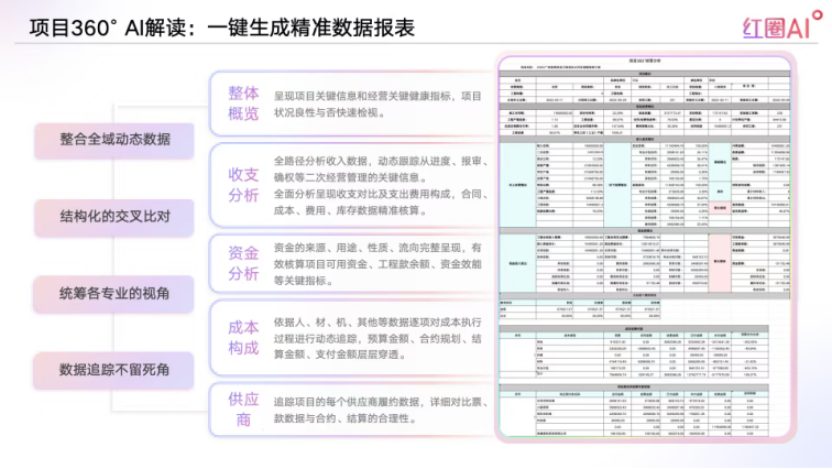 比如項目360°AI解讀,你想了解某個項目的情況,不用再讓下屬寫報告——點一下按鈕,系統(tǒng)自動生成一份“效益體檢報告”:資金夠不夠用?成本有沒有超支?進度是不是滯后?甚至能告訴你“成本超支是因為某分包商頻繁變更合同”,連優(yōu)化建議都給出來。相當(dāng)于給你配了個“智能參謀”,不用自己扒數(shù)據(jù),問題根因、解決方向全清楚。