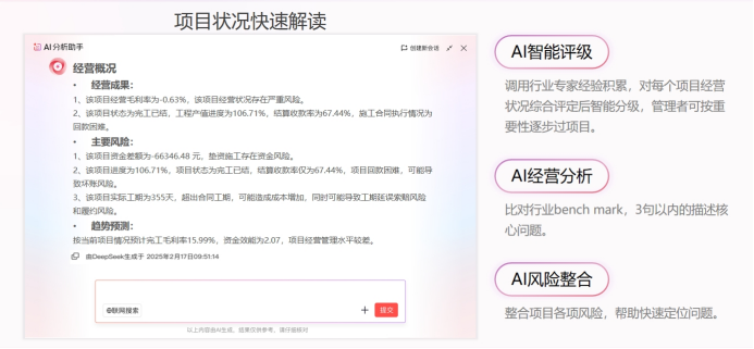 紅圈AI系列智能產(chǎn)品中的項目360°AI解讀,通過整合全維經(jīng)營指標,一鍵生成項目全景作戰(zhàn)圖,讓復(fù)雜數(shù)據(jù)轉(zhuǎn)化為清晰決策語言。該功能能夠?qū)椖拷?jīng)營狀況進行智能評級,并整合各項風險,幫助管理者快速定位問題。通過結(jié)構(gòu)化呈現(xiàn)項目關(guān)鍵信息、收支分析、資金分析和成本構(gòu)成等數(shù)據(jù),項目360°AI解讀使項目進度監(jiān)控更加精準高效。這種透明化的進度跟蹤,不僅提高了項目執(zhí)行效率,也降低了因延期導(dǎo)致的額外成本。