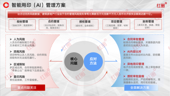 在企業(yè)的運(yùn)營(yíng)脈絡(luò)中,印章雖小,卻承載著沉重的法律責(zé)任與經(jīng)濟(jì)風(fēng)險(xiǎn)。面對(duì)合同協(xié)議繁多、應(yīng)用場(chǎng)景復(fù)雜的業(yè)務(wù)環(huán)境,特別是對(duì)于建筑工程類企業(yè)而言,依賴人工管理的傳統(tǒng)用印模式已顯疲態(tài),在風(fēng)險(xiǎn)控制與運(yùn)營(yíng)效率方面捉襟見(jiàn)肘。基于對(duì)建筑行業(yè)數(shù)字化進(jìn)程的深刻洞察,紅圈軟件推出了「智能AI印控一體化解決方案」,旨在以科技創(chuàng)新驅(qū)動(dòng)管理變革,引領(lǐng)企業(yè)實(shí)現(xiàn)用印流程全面、徹底的數(shù)字化與智能化轉(zhuǎn)型。
