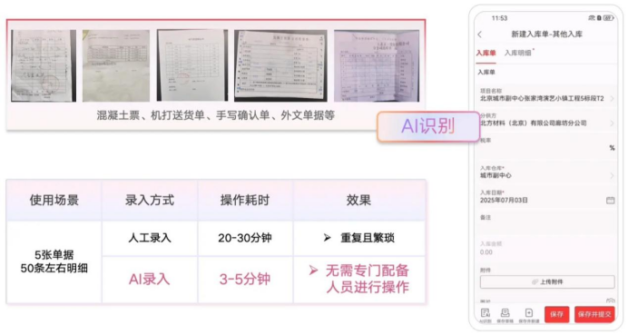 數(shù)據(jù)的源頭是業(yè)務(wù)單據(jù),錄入的繁瑣與錯誤是成本失控的隱患之一。紅圈AI系列智能產(chǎn)品中的AI錄單助手作為企業(yè)的“智能掃描儀”,能通過大模型自動識別混凝土票、送貨單、手寫確認(rèn)單乃至合同等各類單據(jù),實(shí)現(xiàn)從圖像識別到高質(zhì)量系統(tǒng)錄入的秒級閉環(huán),可減少90%人工操作。它不僅能提取關(guān)鍵字段,更能智能匹配合同明細(xì)、關(guān)聯(lián)歷史數(shù)據(jù),讓成本歸集更智能、溯源更方便,從而迭代了整個(gè)成本管控流程。