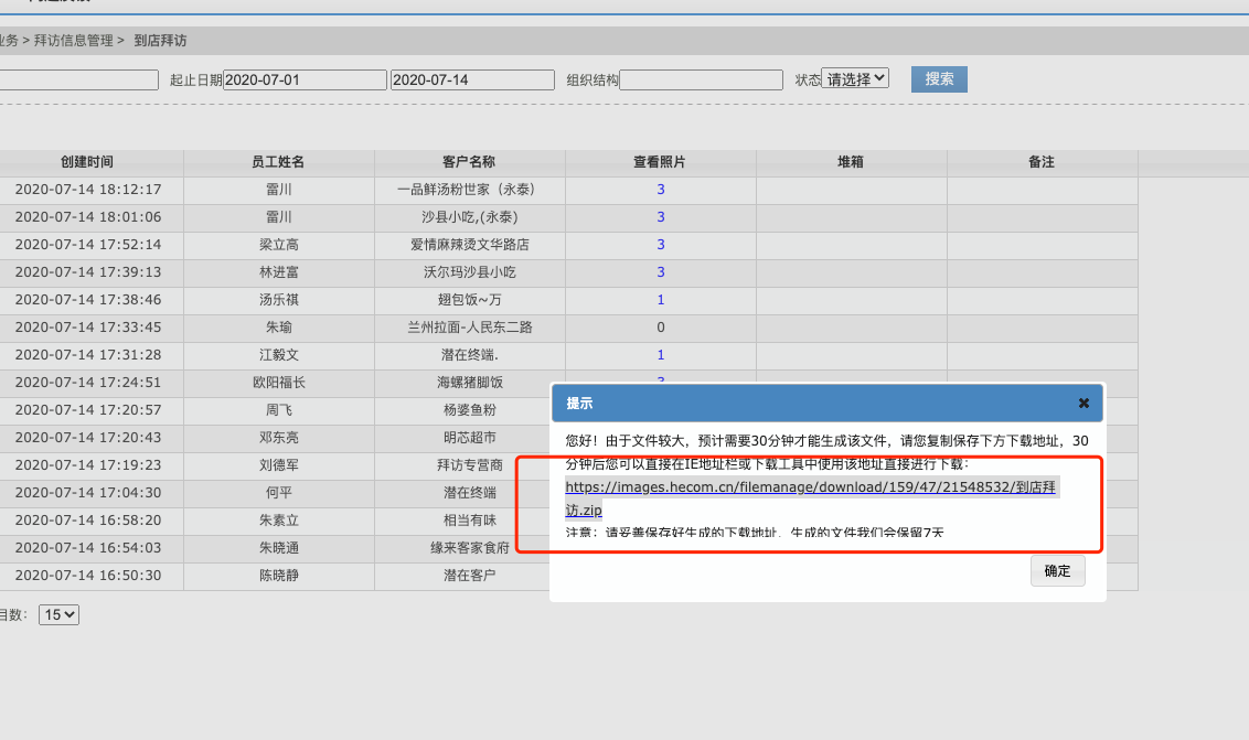 帶圖片數據可能會比較大,中等企業(500人以下)一個月驗證生成壓縮包文件大小有幾百M左右(主要是圖片太多占用空間),點擊導出以后記錄生成的下載鏈接一般15分鐘左右后可以開始下載,如果下載不成功說明文件還沒有生成完(數據庫查詢完數據再寫入Excel文件,包括寫入圖片,會比較耗時)。